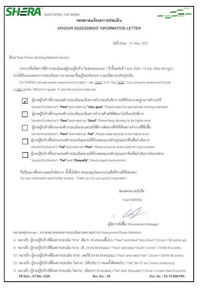 中材節(jié)能所屬武漢建材院榮獲泰國Shera集團(tuán)2020年度供應(yīng)商年度A級滿分供應(yīng)商