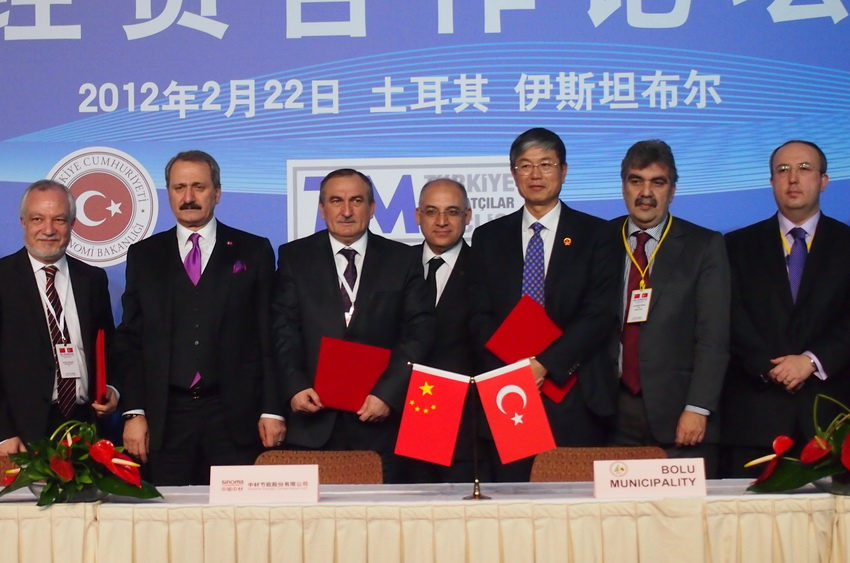 中材集團(tuán)董事長譚仲明率團(tuán)與來自中土兩國的企業(yè)家和各界人士500多人出席論壇。期間,譚仲明與BOLU市長Alaaddin Yilmaz分別代表中材集團(tuán)及土耳其BOLU市政府簽署了合作框架協(xié)議。中國商務(wù)部國際貿(mào)易談判代表兼副部長高虎城及土耳其經(jīng)濟(jì)部長恰拉揚(yáng)等見證了簽約。